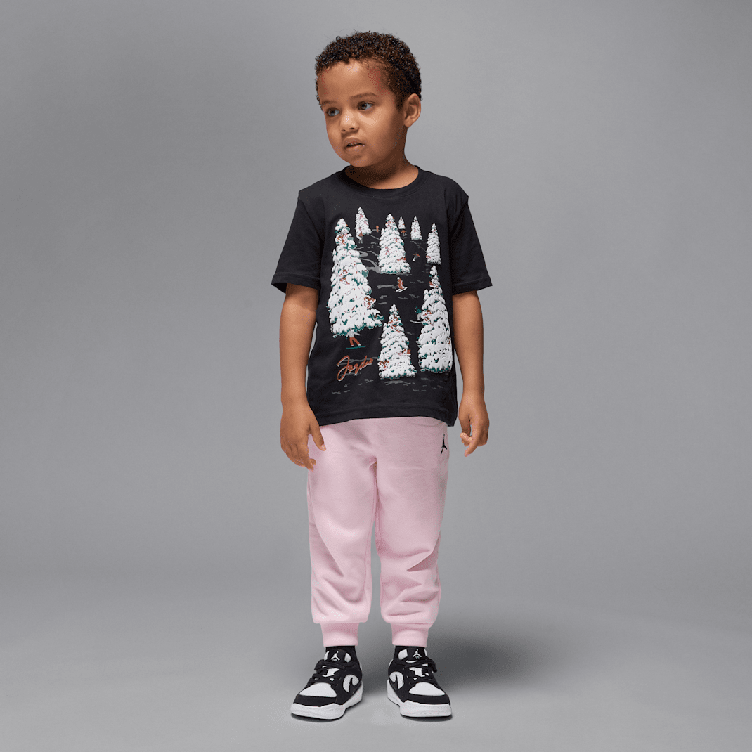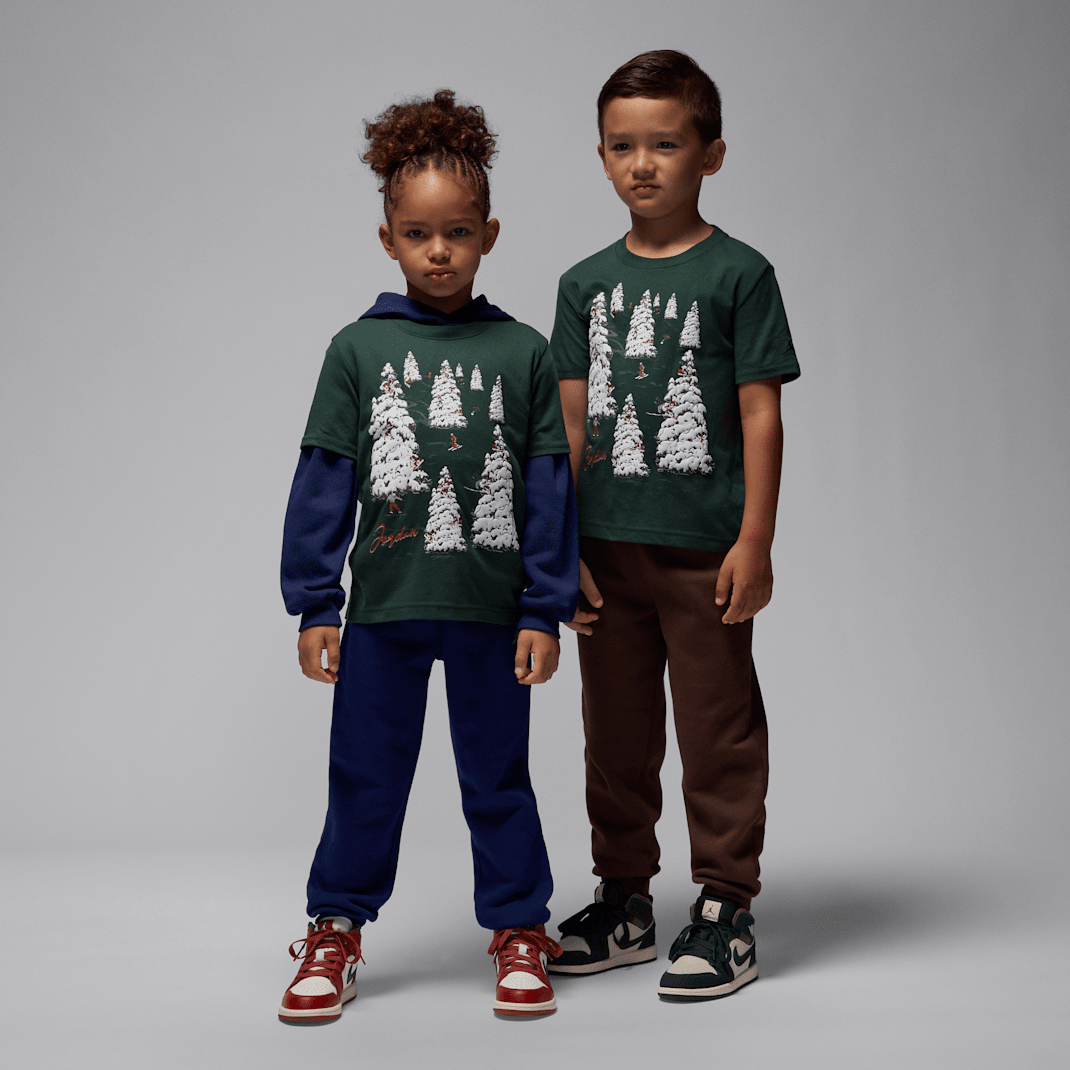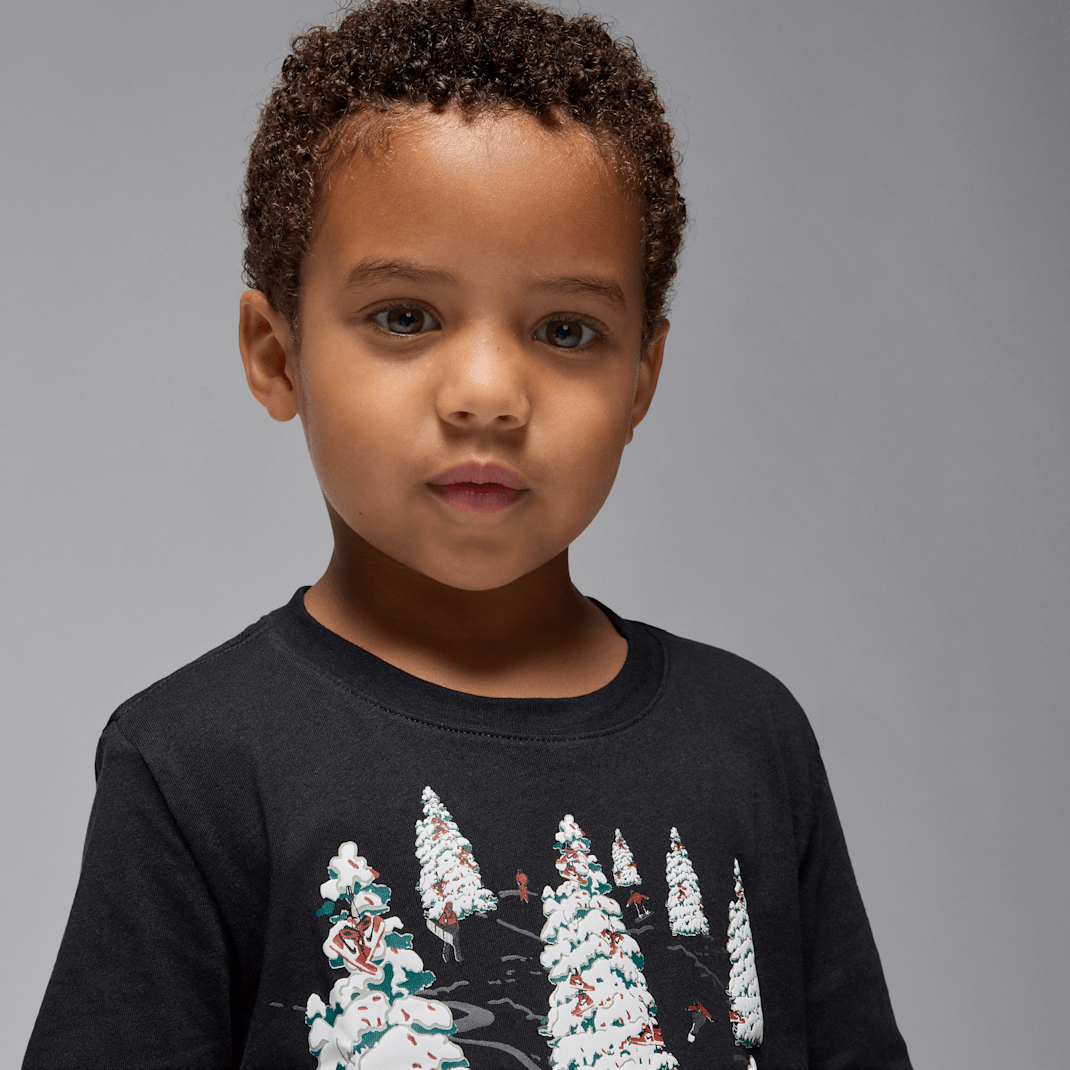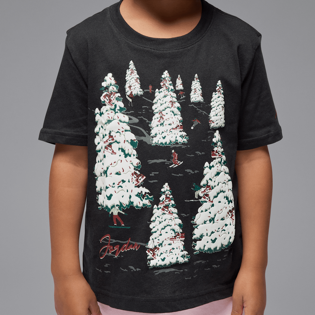 Featuring a festive winter scene, this tee is hoop style for the holidays and beyond made of jersey knit fabric in a short-sleeve silhouette with dropped shoulders that relax the fit. Style with a pair of Jordan joggers for a cozy, coordinated look that will complement your kiddo’s kicks.