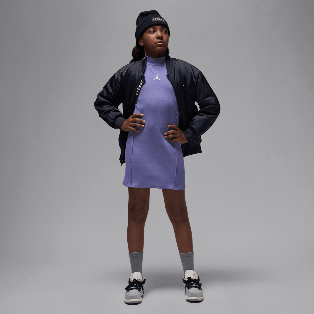 Sleek and stylish, this dress looks just as great with mary janes or flats as it does with your favorite pair of Jordans. It’s made of cotton/poly rib knit fabric with added stretch so you can move however you want, comfortably. The mock neck is modern, short raglan sleeves add a sporty touch, and taping insets create a flattering silhouette.