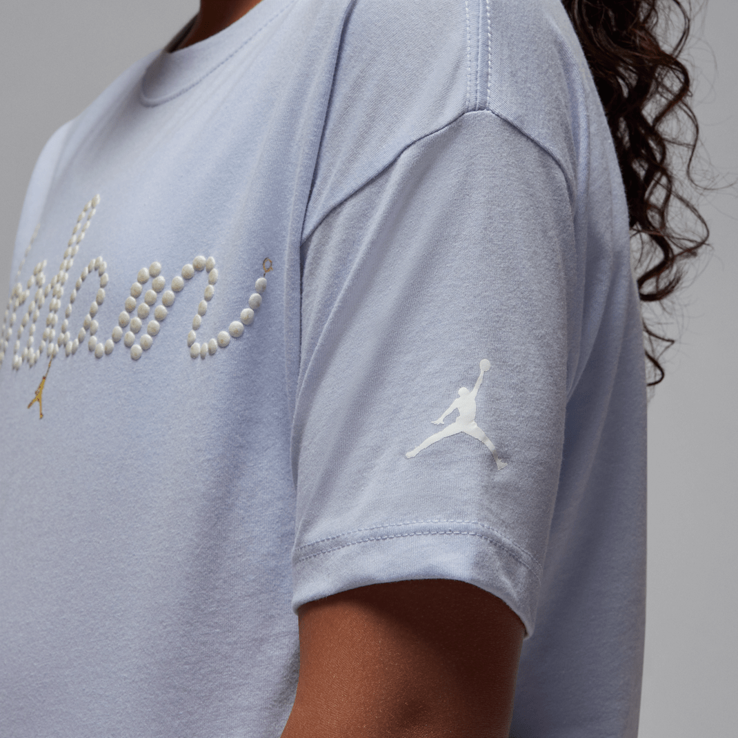 Complement your Jordans with this this tee, which features a textured necklace graphic and is made of blended cotton in a short-sleeve silhouette with a tagless crewneck for comfy wear.