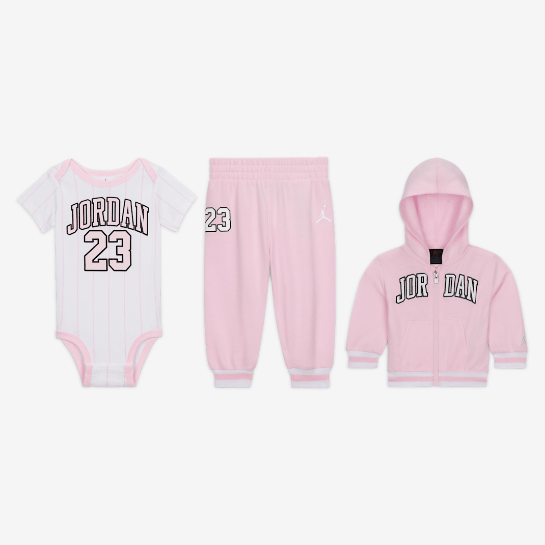 This 3-piece set is an effortless way to dress smaller ballers in coordinated, comfy Jumpman style. The French terry hoodie has a roomy cut and a full-zip closure that makes layering easy and the matching pants, also made of French Terry, have a comfy stretch waistband. The soft cotton/poly jersey knit bodysuit has lapped shoulders and snappy tape closures on the crotch for easy changing and dressing.