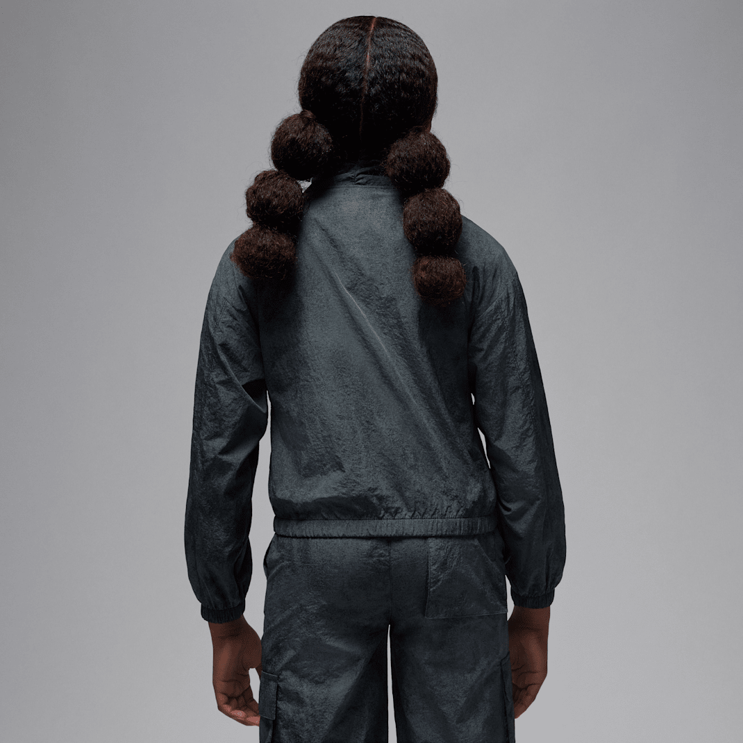 Made of lightweight crinkle nylon fabric in a roomy, cropped silhouette, this jacket is a great way to add a little bling to your style. It has a snap-front closure, dropped shoulders that relax the fit, spacious cargo pockets with hook-and-loop flap closures help secure your small essentials, and dropped shoulders relax the fit. Style with the Jordan Blue Jeans and Bling Woven Pants for a coordinated look.