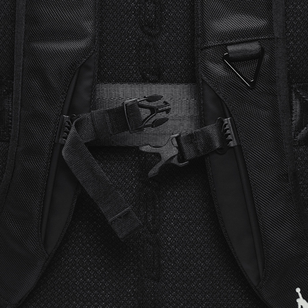 Carry your stuff in DNA style with this spacious Jordan backpack. The spacious main zippered compartment can hold books, a change of clothes or whatever else you need. The zippered compartment on the back is padded to help secure a laptop or tablet. Keep up with hydration by using the side bottle pockets, the laced bungee cord on the front can be used to hold something extra and the adjustable padded straps provide comfortable wear. What really puts this backpack over the top are the organizational pockets and the ventilated shoe garage at the bottom!