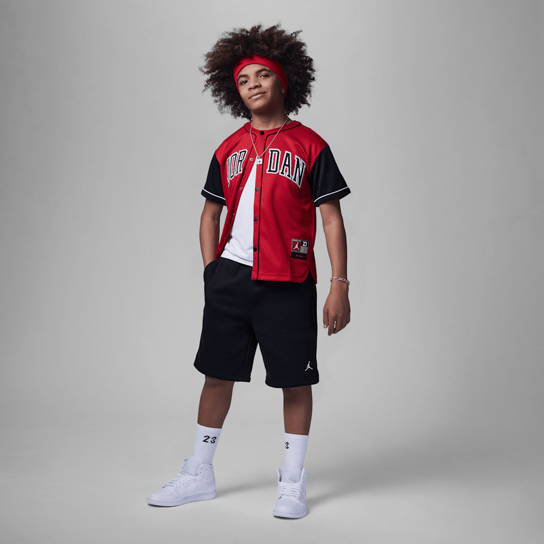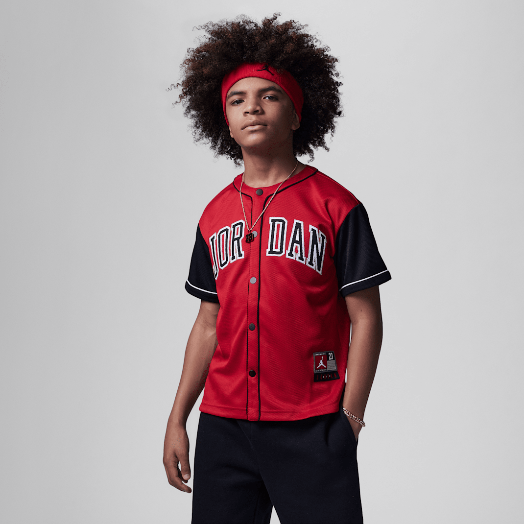 This baseball jersey, made of breathable poly mesh fabric, is inspired by Michael Jordan’s time playing baseball. The snap front closure and roomy cut make layering easy while creating multiple styling options. Wear this jersey tucked in the classic baseball uniform style or untucked for a more casual style. Pair with any Jordan bottoms for a coordinated, sporty look or with jeans for cool streetwear style.