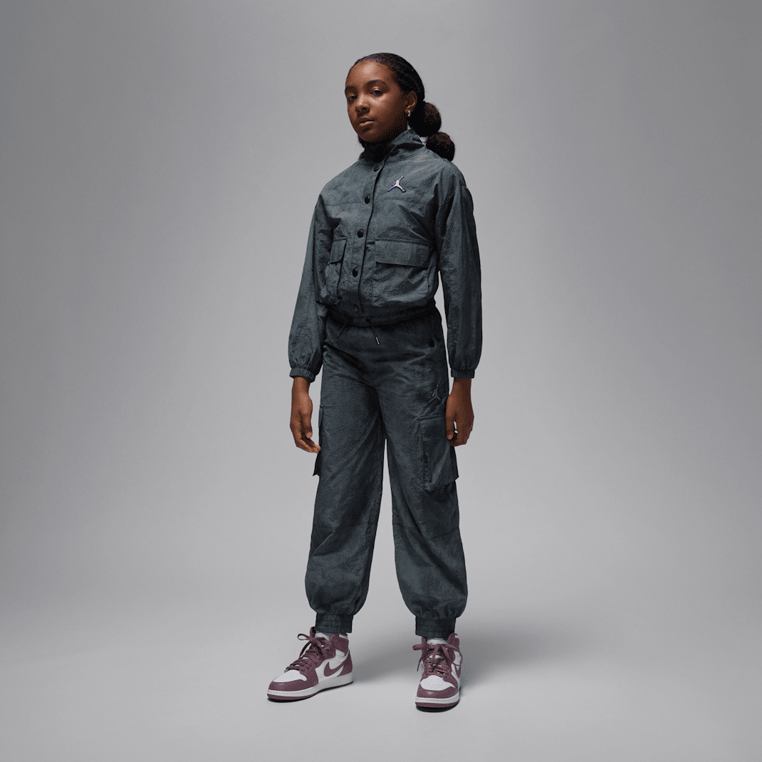 Made of lightweight crinkle nylon fabric, these lightweight pants are a great way to add a little bling to your style. The stretch waistband has a drawcord for comfy wear, the tapered legs have elasticized cuffs that create a puff look, and multiple cargo pockets can help secure your small essentials. Style with the Jordan Blue Jeans and Bling Lightweight Jacket for a coordinated look.
